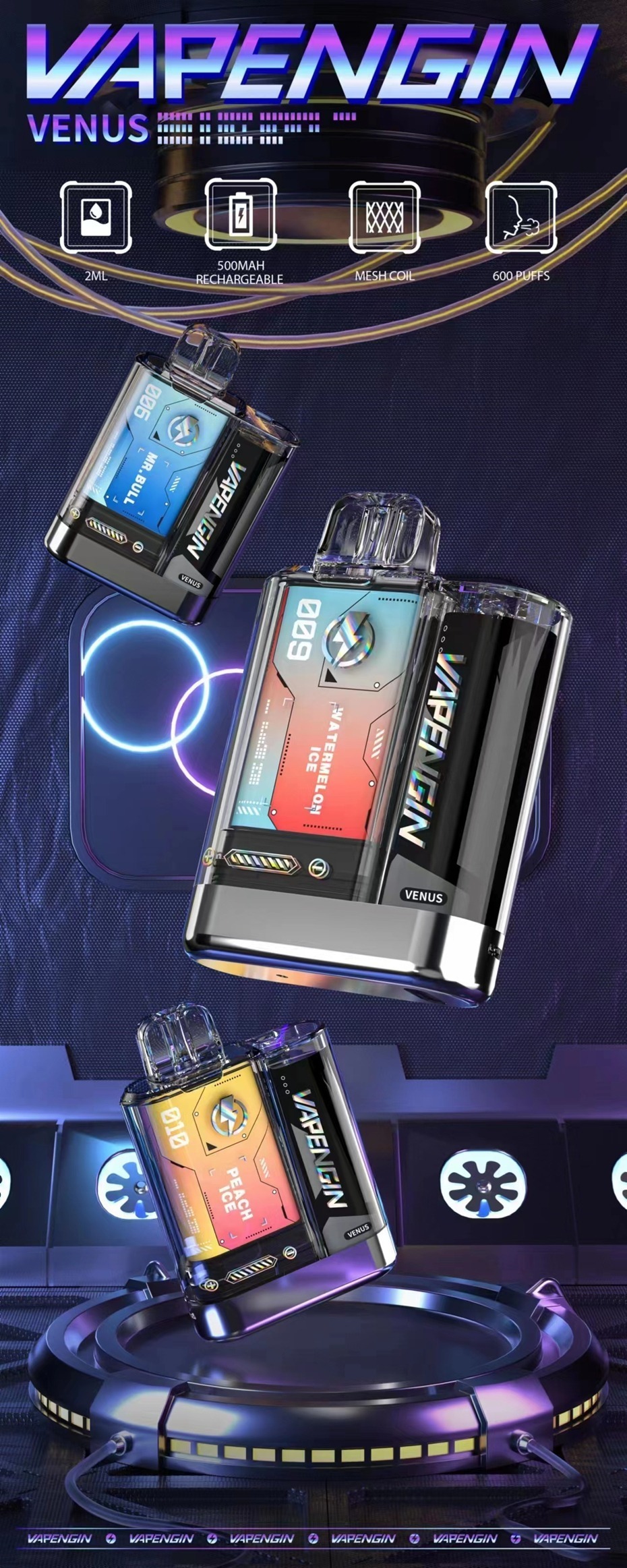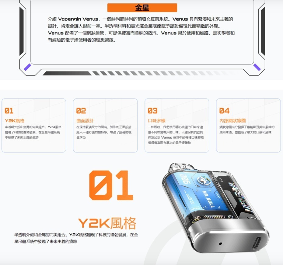 金星隆重推出 Vapengin Venus,一款時尚的預裝煙彈系統。Venus 採用緊湊且充滿未來感的設計,一定會引人注目。半透明材料和高光金屬底座賦予該設備現代而精緻的外觀。Venus 配備了網狀線圈,可提供豐富而美味的蒸汽。Venus 易於使用和維護,使其成為初學者和經驗豐富的電子煙愛好者的理想選擇。